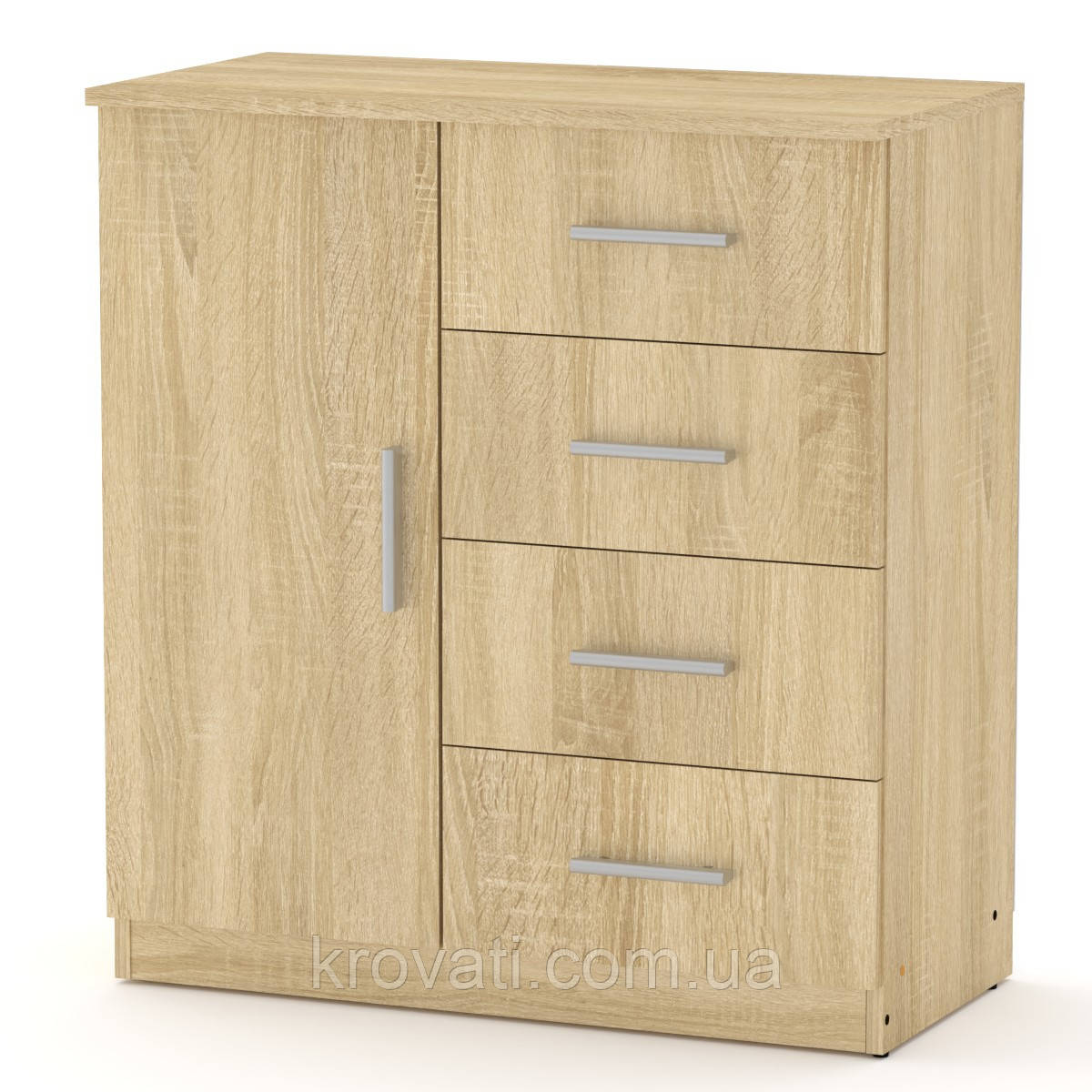 Комод виконаний з ламінованого ДСП, товщиною 16 мм Комод незамінний елемент для будь-якої кімнати. Комод 4+1А складається з трьох висувних ящиків на роликових напрямних і двох секцій з орними дверцями. Велика кількість кольорів ДСП дозволити списати цей елемент меблів в будь-який інтер'єр.
